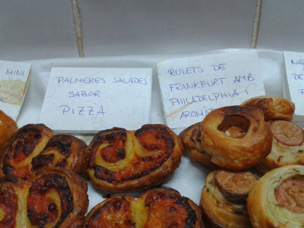 Rollitos de salchicha: se unta de queso philadelphia el hojaldre y se ponen hierbas aromáticas; se cogen las salchichas de frankfurt y se empiezan a enrollar por un lado hasta que quede todo enrollado. También se corta a rodajitas de 1-1,5 cm.