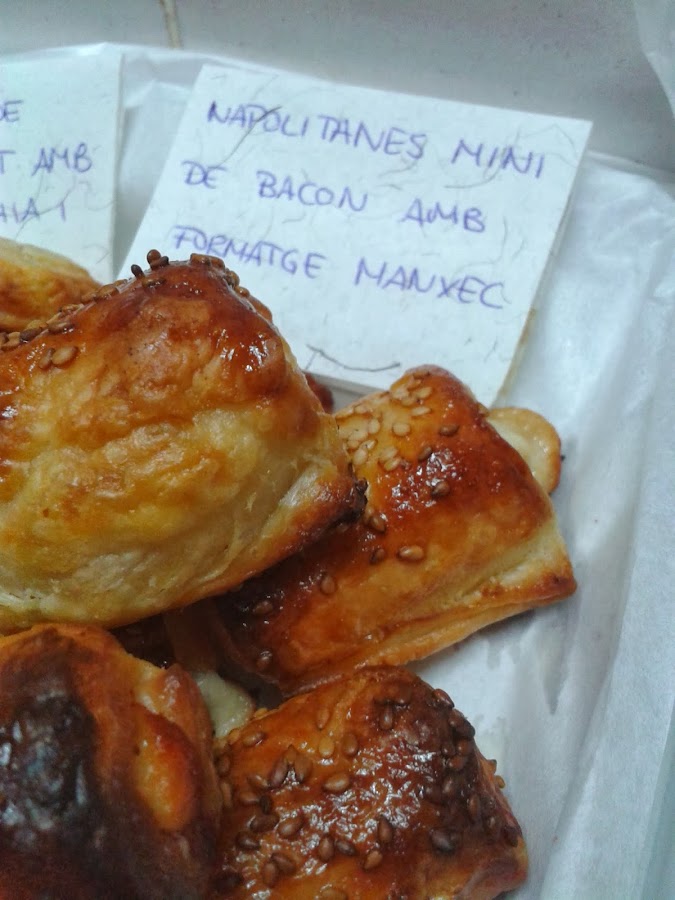 Mini napolitanas de bacon y manchego: cortar el hojaldre a cuadrados, poner un trocito de queso enrollado por un trocito de bacon en el centro (y que ajuste con los bordes para que no quede hojaldre vacío) y enrollar el hojaldre.