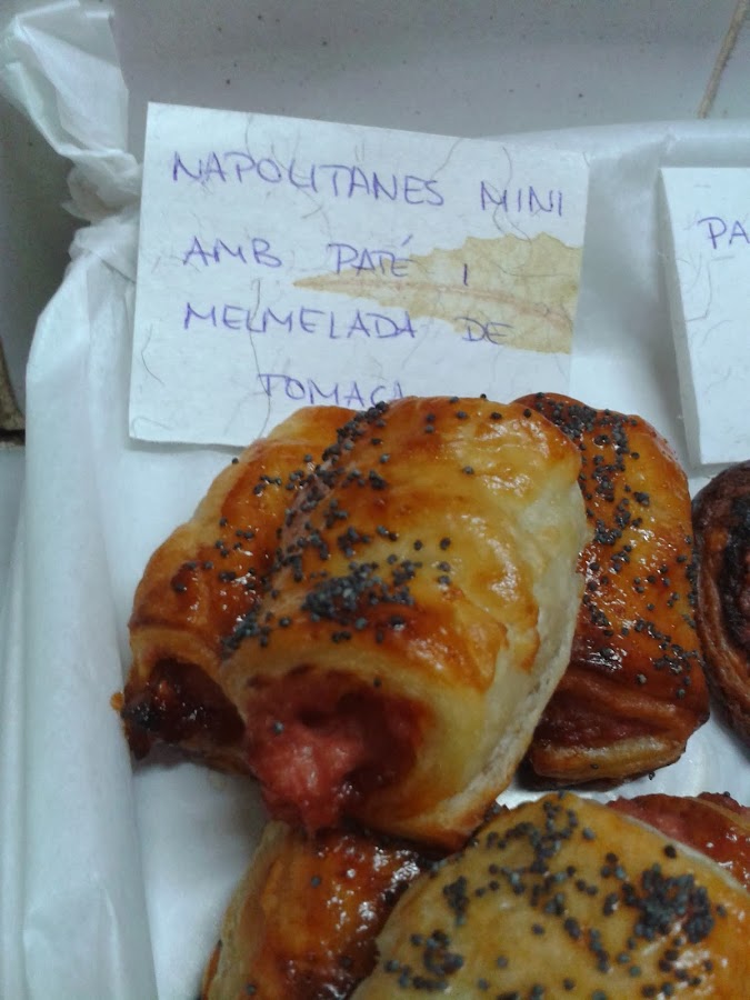 Mini napolitanas de paté y mermelada de tomate: lo mismo que el anterior pero poniendo una cucharadita de paté y un poco de mermelada encima.