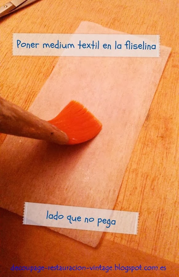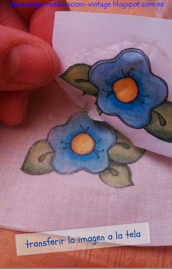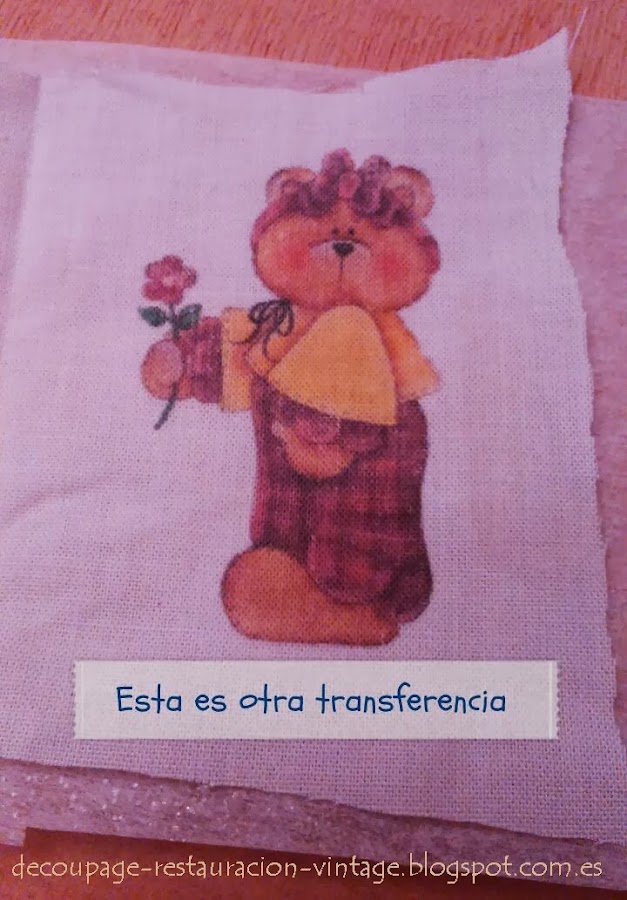 Ponemos medium textil en la cara de la fliselina que no tiene el pegamento y ponemos la imagen del transfer.