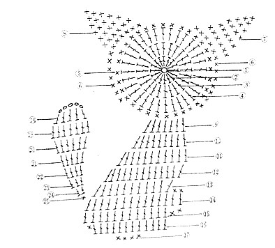 También os digo que lo he tenido que ir modificando un poco sobre la marcha porque si lo seguía exacto la figura no quedaba plana. (aumentando más puntos en la cabeza= 1v anillo8p, 2v 8 aum pa(16), 3v 1pa, 3aumx4 (18), 4v 1pa,1aum(42))