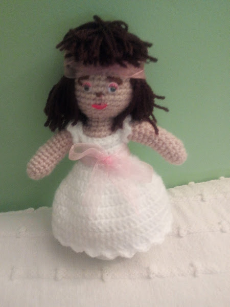 Rebeca nos propuso en su Desvanero nº 23 el tema "Flecos", un tema difícil, difícil pero una compañera me dijo que su sobrina iba a hacer la Primera Comunión y pensé en hacerle una muñequita para ese día tan especial pero... la pobre muñeca salió con unos pelos de loca que junto con la carita no parecía una dulce muñeca de comunión sino una brujita vestida de blanco. El caso es que el pelo son flecos de lana aplicados en toda la cabeza, como siempre no hice fotos para que se viera el proceso pero es similar al que se hace para colocar los flecos en un chal pero en este caso en la cabecita. De todas las maneras, esta muñeca la podéis ver en el blog El Mundo de los Amigurumis, bueno ésta no otra mucho más mona porque quise hacerla un poco diferente y ya sabéis lo que me suele pasar, ¡¡un desastre!!. Ni que decir tiene que tengo que hacer otra para la niña que está en proceso.