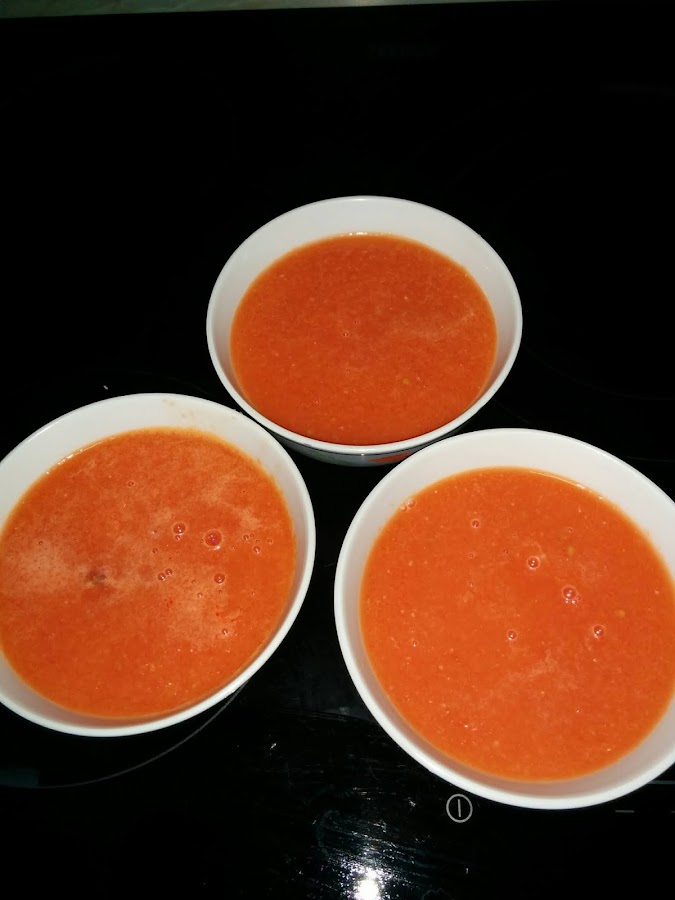 Se pone todo en una batidora, se tritura y se añade agua según la textura que se quiere conseguir. Se mete en la nevera y se añade un par de cubitos de hielo y se sirve como una sopa acompañada de trocitos de huevo duro y jamón o como bebida refrescante con un par de cubitos de hielo.