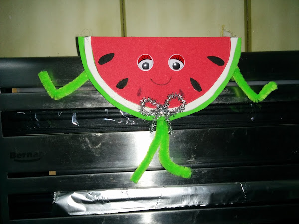 Pero como éste no es un blog de cocina sino de manualidades (aunque esta receta es una manualidad total) os presento este trocito de sandía hecho con goma eva y que es muy sencilla de hacer como podéis ver.