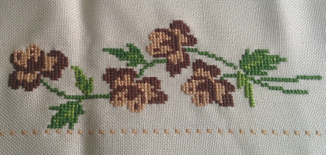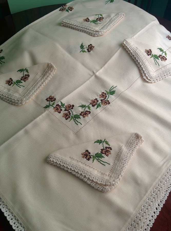 Busqué una cenefa de un cuadernillo de punto de cruz que compré para la ocasión y seleccioné tonos marrones y verdes y me puse manos a la obra. El caso es que iba muy bien, pero a mitad de mantel me di cuenta que el dibujo se iba subiendo y subiendo y subiendo de manera que aquello saldría del mantel de seguir así. Deshice todo lo bordado y volví a empezar pero ya con menos entusiasmo, pasó lo mismo y volví a deshacer, hasta tres veces. Desesperada comencé a pensar como hacer la dichosa mantelería, así que decidí hacer ramilletes en el centro del mantel (no os fijéis en las arrugas porque lleva mucho tiempo doblado y no lo he planchado como puede apreciarse)