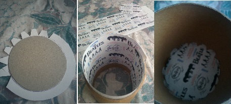 Forramos el círculo que nos servirá de base del bote, dejando un par de centímetros de margen para poder pegarlo al cilindro. Para que se sujete a las paredes haremos unos cortes al rededor de todo el círculo y doblamos las pestañas hacia fuera para pegarlas al bote, a la vez cortamos otro círculo igual pero justo al círculo para forrar la base del bote. La parte forrada del cartón redondo quedará como base interior del bote y las pestañas están pegadas a las pareces interiores.
