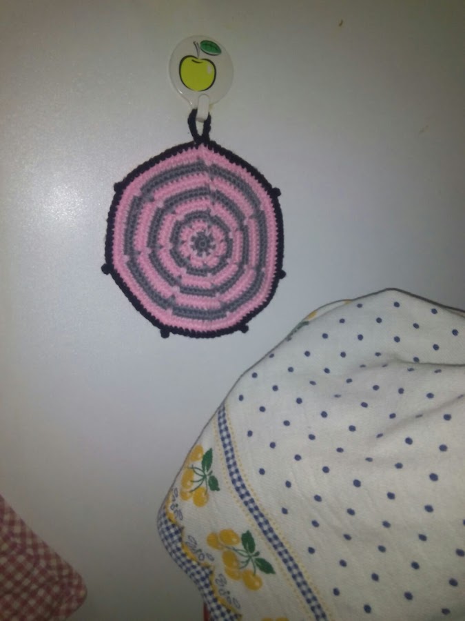 Como son tan rápidos de hacer, pensé que debería añadir otra manualidad a mi Reto. Cogí el ganchillo y mientras veía por tercera vez "El Ministerio del Tiempo" con mi sobrina, salió este agarrador para no quemarnos las manos al sacar la taza del desayuno del microondas.