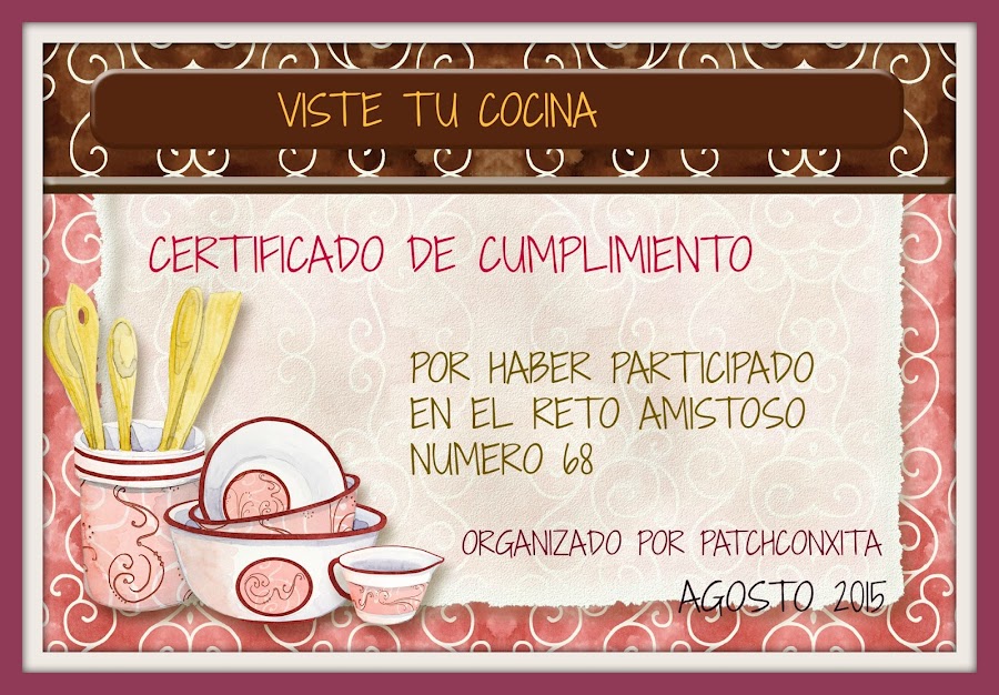 Espero que os gusten mis aportaciones. A mi me ha encantado participar por primera vez en un Reto. Muchas gracias a Conxita de http://patchconxita.blogspot.com.ar/2015/08/reto-numero-68.html#gpluscomments y a su niña por hacer un certificado tan bonito.