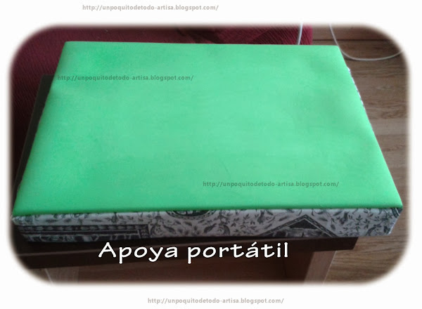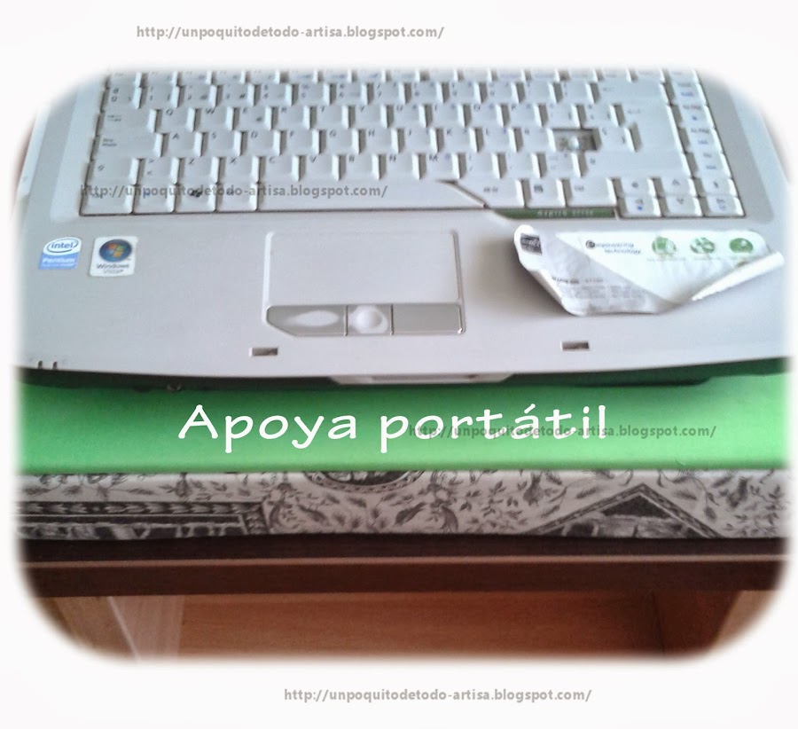Hola como vais?¿?¿ ya estamos en navidad... hace días que no actualizaba, pero es que no encuentro los momentos para sentarme a escribir.... Hoy os quiero enseñar un apoya-portátil, y mesa para portátil o no sé muy bien como se llama :), lo hice hace ya casi un año para mi ordenador y así no tenerlo siempre sobre los muslos. También hice otro para el portátil pequeño de mi hija, pero no le he hecho fotos, otro día os lo enseño.