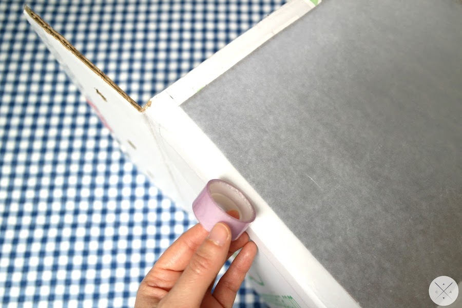 Es importante sólo cortar 3 lados de la caja y dejar su fondo y otro de los lados sin cortar. A continuación, pegamos con cinta adhesiva el papel de seda a ambos lados de nuestra caja