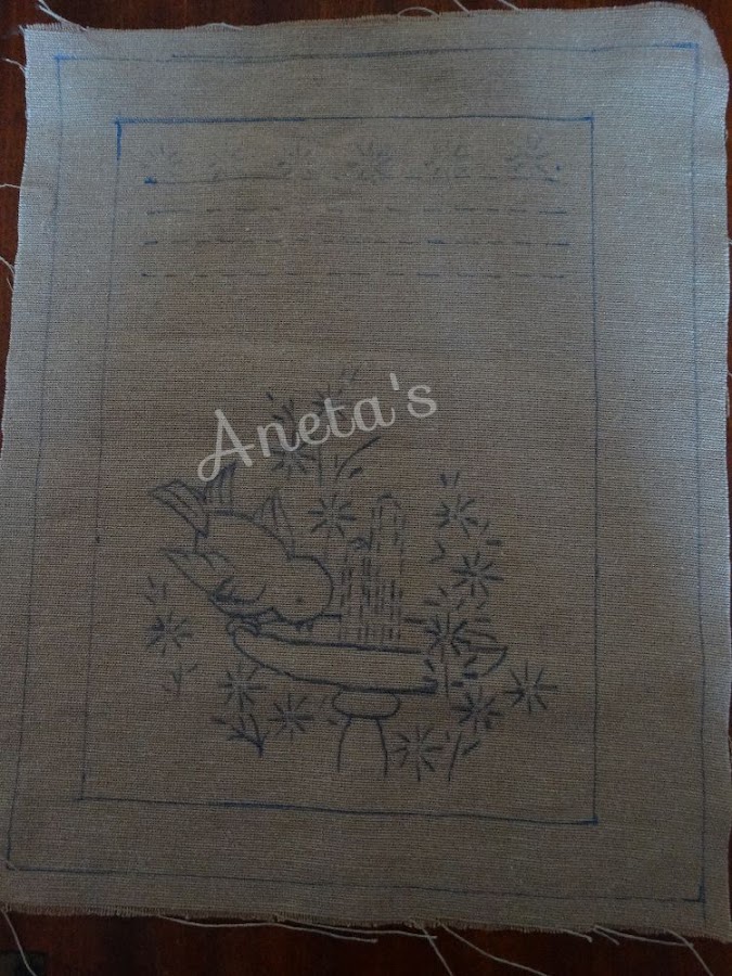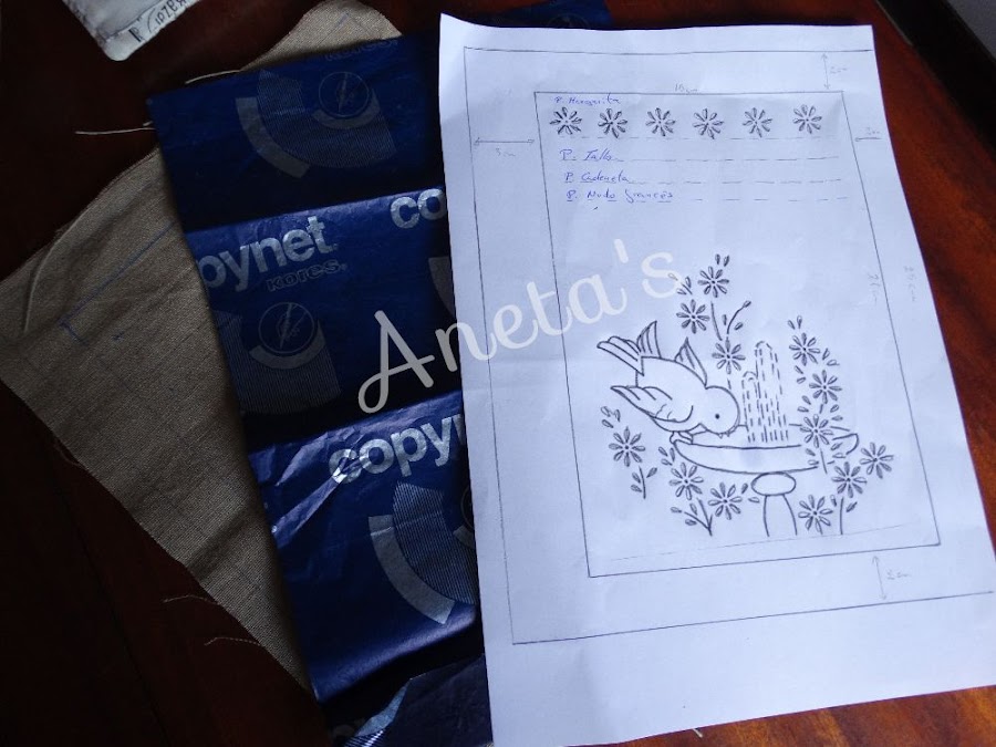 A continuación he puesto un papel de calca en la tela y he calcado el dibujo, cuidándolo para que quedara bien centrado.