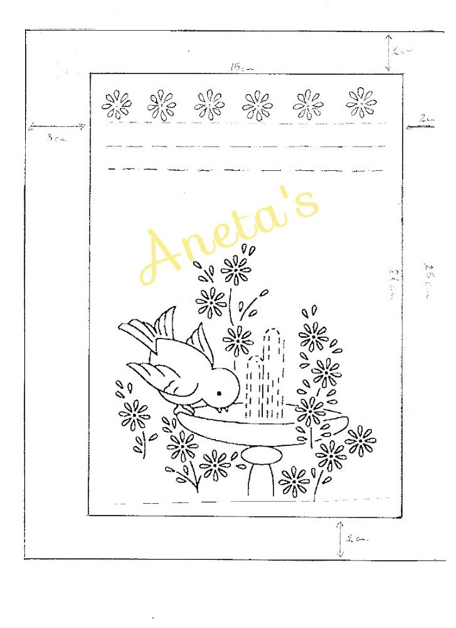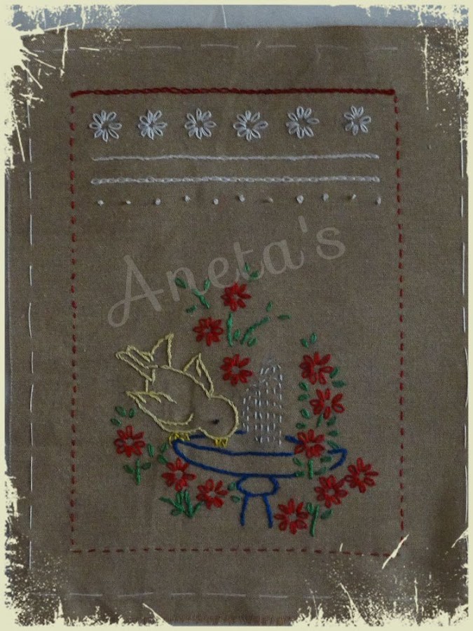 2- Esta vez en el dibujo he utilizado varios colores y los puntos que hemos aprendido. Las flores, punto margarita, el pajaro y la fuete y ramas de las flores punto tallo, ojo del pajaro punto nudo francès y el agua de la fuente en punto Bastilla, que aprendimos en la anterior entrada.