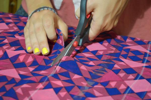 Para este kimono elegí una tela estampada tipo gasa. Lo primero que hay que hacer es emprolijar los bordes de forma que queden rectos.
