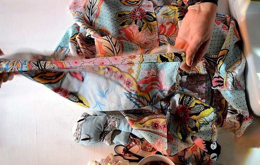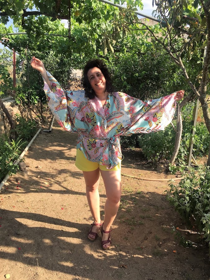 Nuestro kimono esta listo para ser estrenado. Veis que sencillo es la realización, necesitamos un poco de paciencia, porque esta tela es difícil de manejar y una tela bonita para hacerlo.