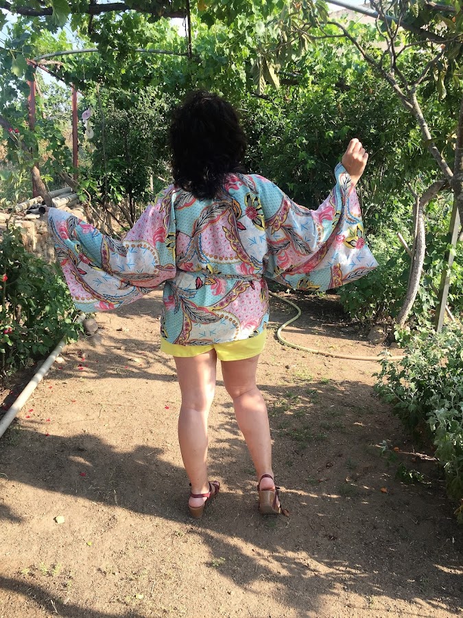Hoy quiero enseñaros como hacer un kimono de una forma muy sencilla, sin patrón, solo tenéis que elegir una tela bonita, con mucha caída y un estampado llamativo y en una horita o dos, depende de la destreza de cada uno tendremos nuestro kimono listo para poner.