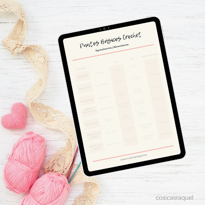 Una tabla en PDF con la lista de puntos básicos de crochet en español (dos versiones), inglés US y UK con sus equivalencias.