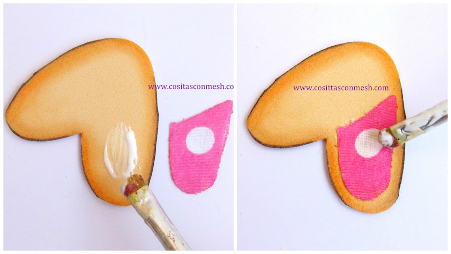 5.- Para la panza del conejito, aplico pegamento, y de inmediato pego la tela.