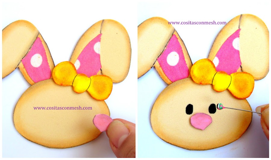 El moñito del conejo lo hice en foami amarillo, la nariz en rosa, pego ambos moldes.