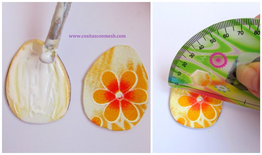 Para decorar el huevo de pascua, uso otro retazo de tela, una vez que este pegado, con una regla paso encima de la tela, para afirmar lo pegado.