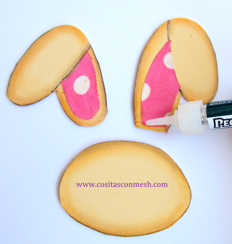 3.- Ahora corto los moldes de tela que decoraran las orejas y panza del conejo de pascua.