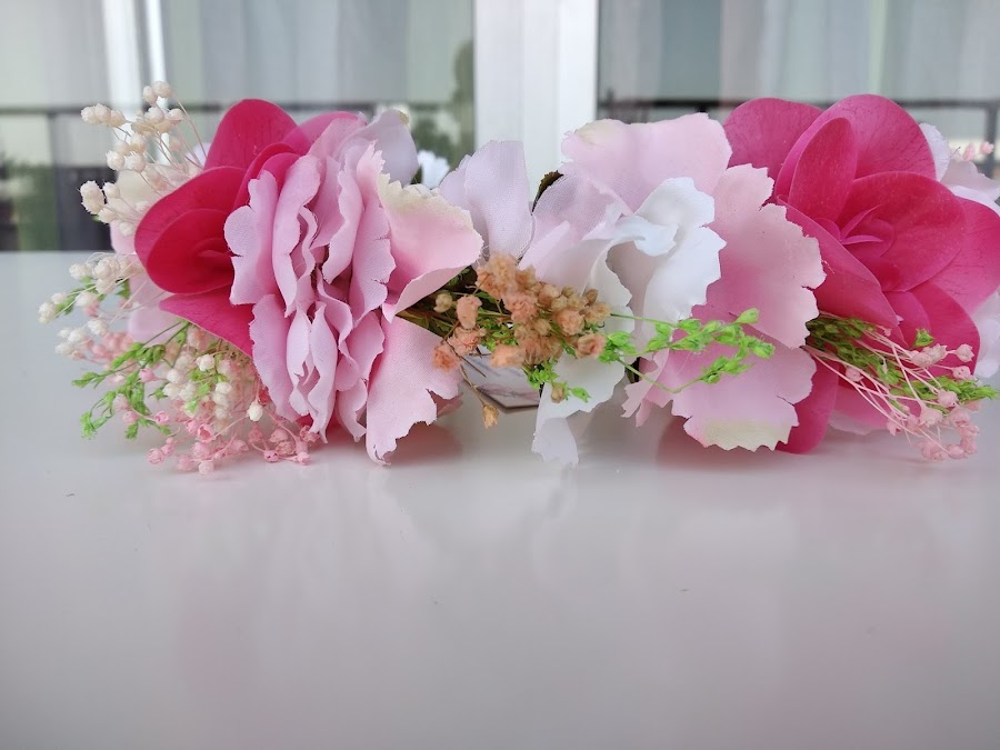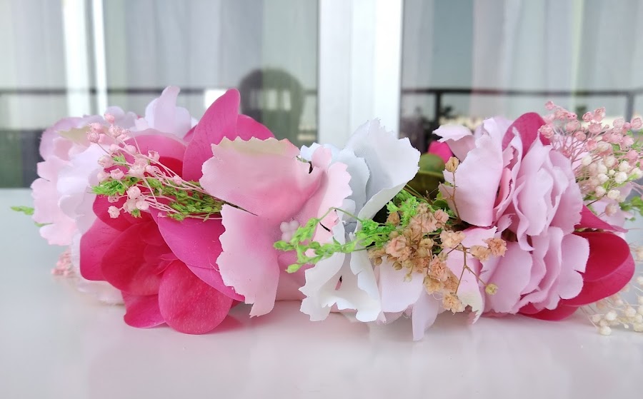 Para realizarla he utilizado distintos tipos de flores secas bloom, paniculata preservada y flores artificiales, alambre, cinta floral, cintas de raso, cinta de terciopelo para el interior de la corona y pistola de silicona caliente.