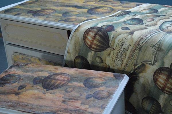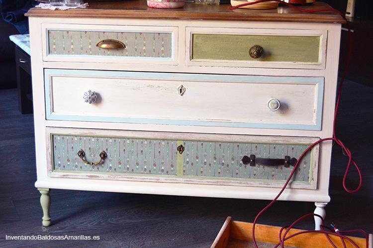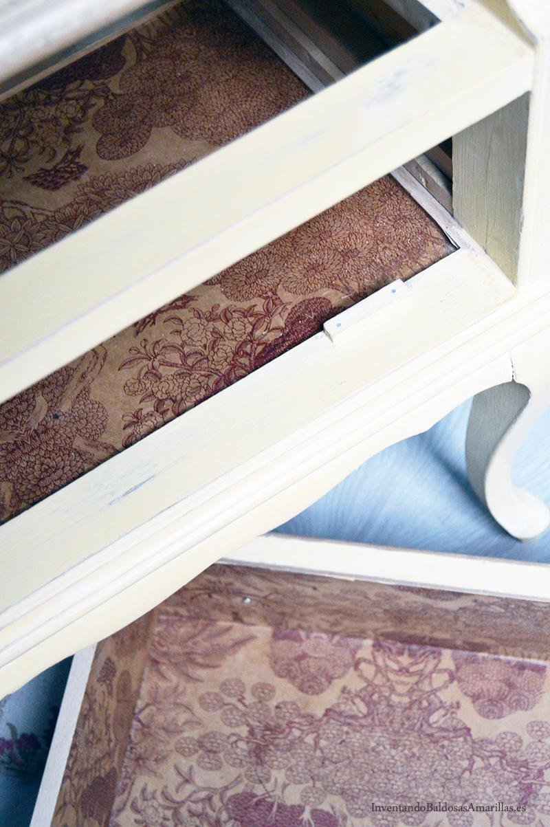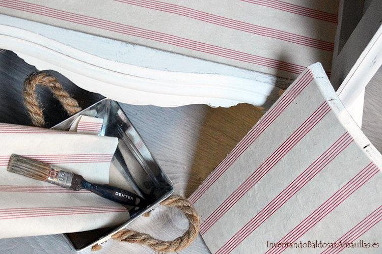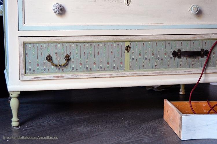 Este papel es perfecto para decorar todo tipo de muebles sin miedo a que queden arrugas en la superficie. Eso sí, transparenta un poco por lo que tenemos que tener en cuenta que se puede ver la superficie donde lo hemos pegado y a veces es necesario pintarla antes como en la cómoda de la foto.