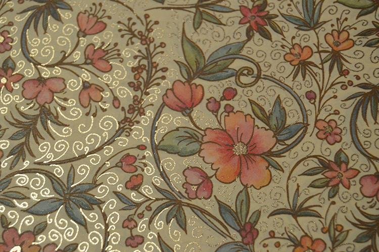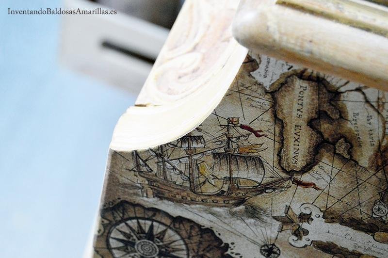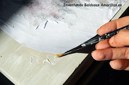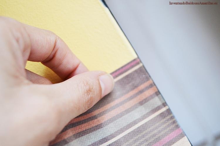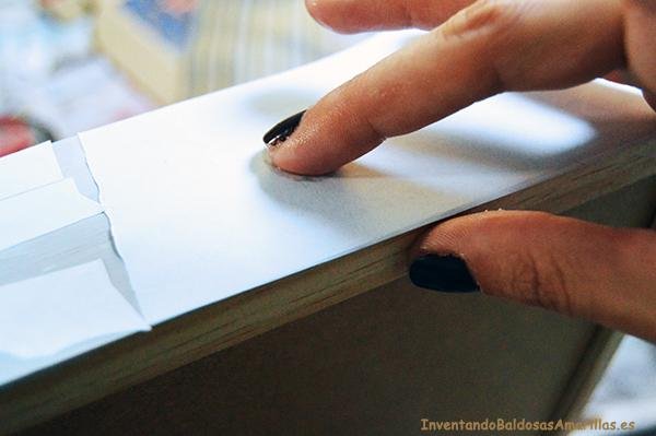 Es mucho más fino que el papel hecho a mano y queda también muy liso una vez que se seca sobre la superficie. Para pegarlo lo que hacemos es dar una capa de pegamento, colocar el papel y estirarlo con la mano o con una tarjeta de crédito envuelta en una bolsa de plástico.