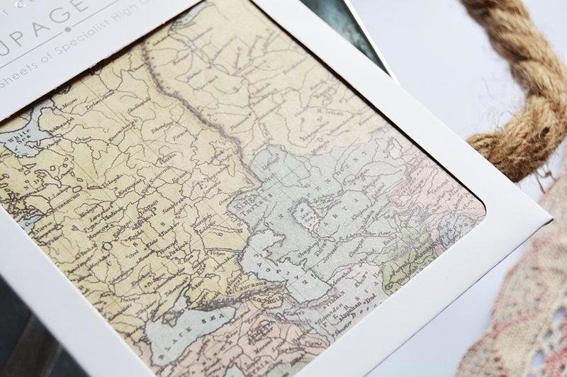 Es un papel hecho a máquina con un acabado perfecto. Es más grueso que el papel maché, pero menos que el papel hecho a mano. El unico problema que tiene es que cuando hacemos cortes se pueden notar mucho y para disimularlos e integrar el papel en nuestra decoración es buena idea usar una tinta para colorear esos bordes a juego con el resto de la composición.