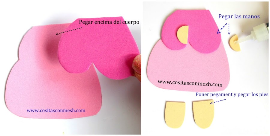 1.- Pego parte de la camisita, el cual lo hice en foami fucsia, luego pego las manos y piernas.