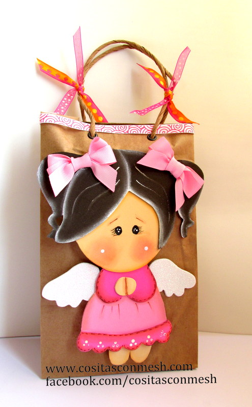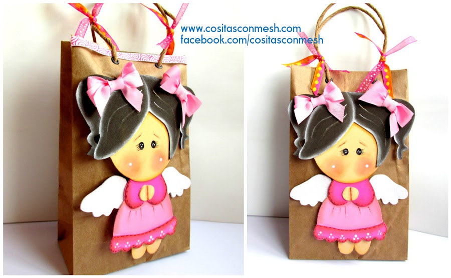 Amigos, hoy les enseñaré cómo decorar bolsas de papel kraft o de cualquier otro tipo, mi idea es hacer la figura en foami de una niña angelito, este lo podemos usar para regalar a nuestros invitados en un bautizo, primera comunión, cumpleaños, día del niño etc.