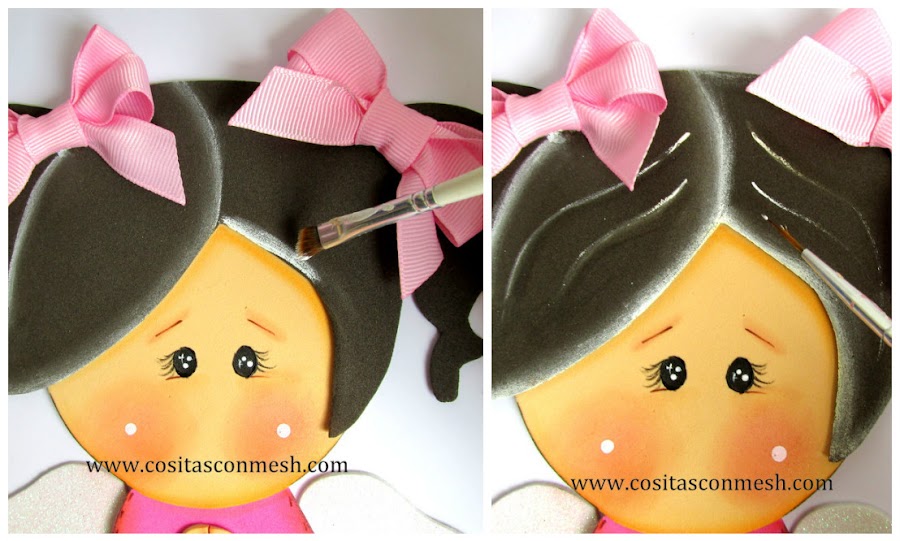 9.-Ahora voy a decorar el cabello mi niñita, uso pincel angular y pintura acrílica blanca, voy a flotar en algunas zonas del cabello, tal cual lo ves en esta imagen.