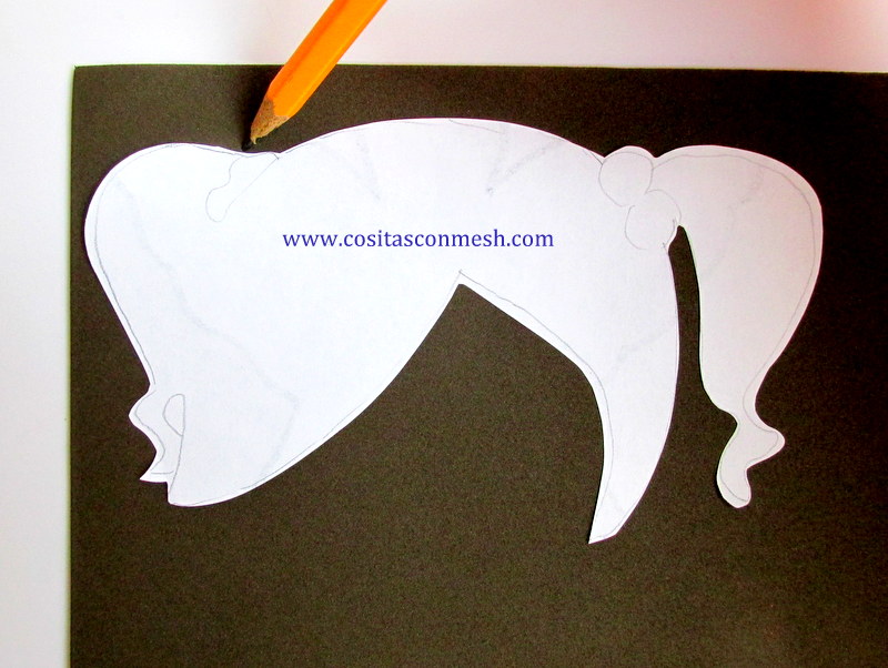 2.- Comienzo por el cabello, uso foami marrón y sobre el con un lápiz trazo todo el molde.
