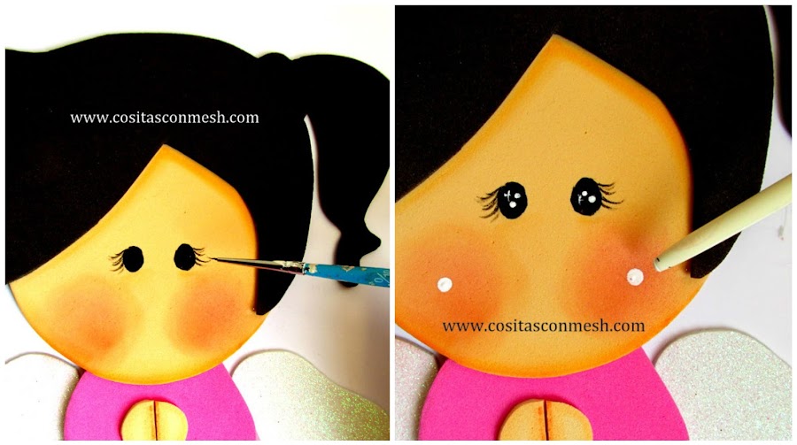 7.- Pinto puntitos blancos en los ojos, aplico rubor con una brocha de maquillaje, luego pinto unos puntitos blancos.
