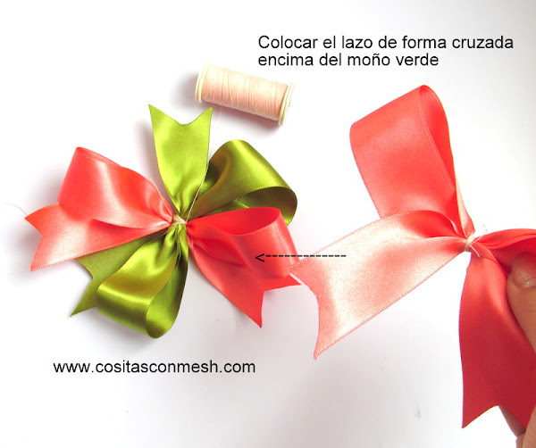 1.-Es de lo más fácil, solo tienes que unir los lazos que ya hicimos, primero pondré el lazo verde por encima del lazo salmón.