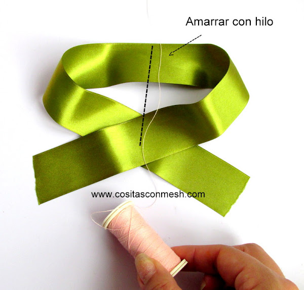 3.-Pon el listón de esta forma déjalo como cruzado, y con hilo de coser color rosa ( u otro color de tono pastel ) amarro por el centro.