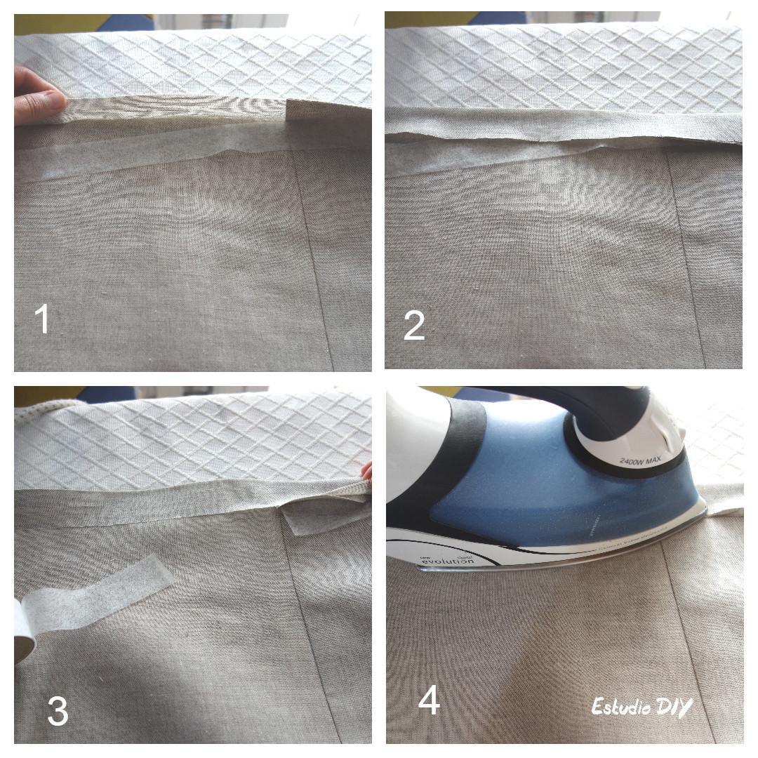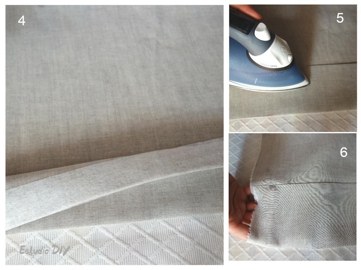 Una vez que tenemos marcadas las dobleces de los jaretones, pasamos a pegar la cinta de friselina. Para ello, situamos la misma en el borde interno del jaretón (foto 4) y planchamos a la máxima temperatura que admita el tejido, para que se fije correctamente (foto5), dar varias pasadas si fuera necesario.