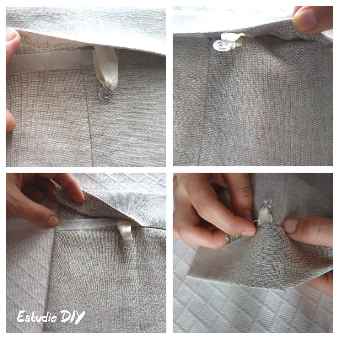 Por último, ya sólo nos queda coser las anillas de plástico a lo largo del jaretón, guardando una distancia de 25 cm. de separación entre una y otra, como se aprecia en la imagen. Marcar la situación con un alfiler y coser con unas pasadas, intentando que no se vea la puntada por el derecho del estor.