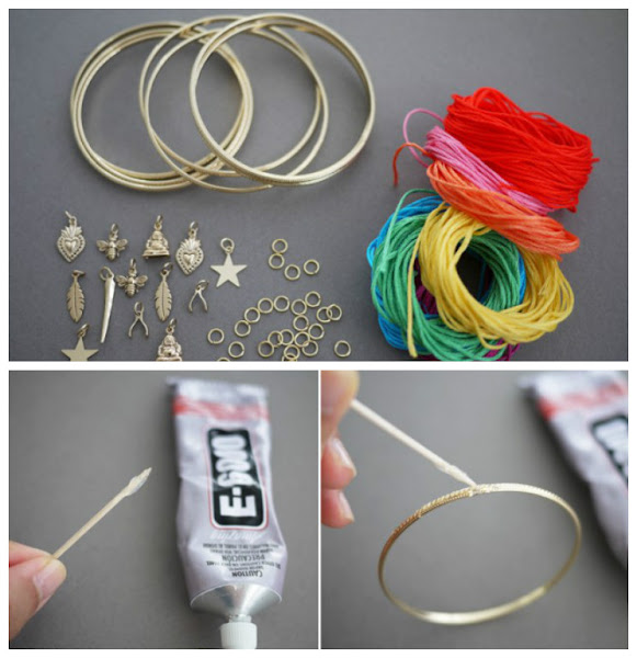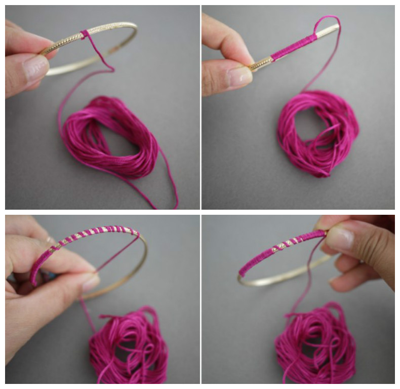 Toma la punta del hilo de seda y pégala sobre el aro. Luego ve enrollando la cinta de modo tal que cubras toda la superficie de la pulsera.