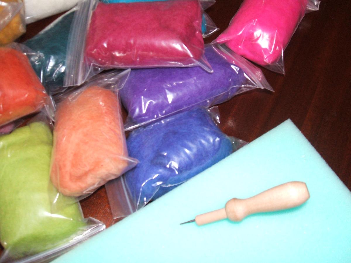 Coloca el broche sobre la gomaespuma y extiende un pequeño mechón de lana cardada sobre el broche. Según vas pinchando sobre la lana, esta se va compactando y quedándose fija en el fieltro. Con la aguja vas colocando la lana y pinchándola para que adopte la forma que deseas.