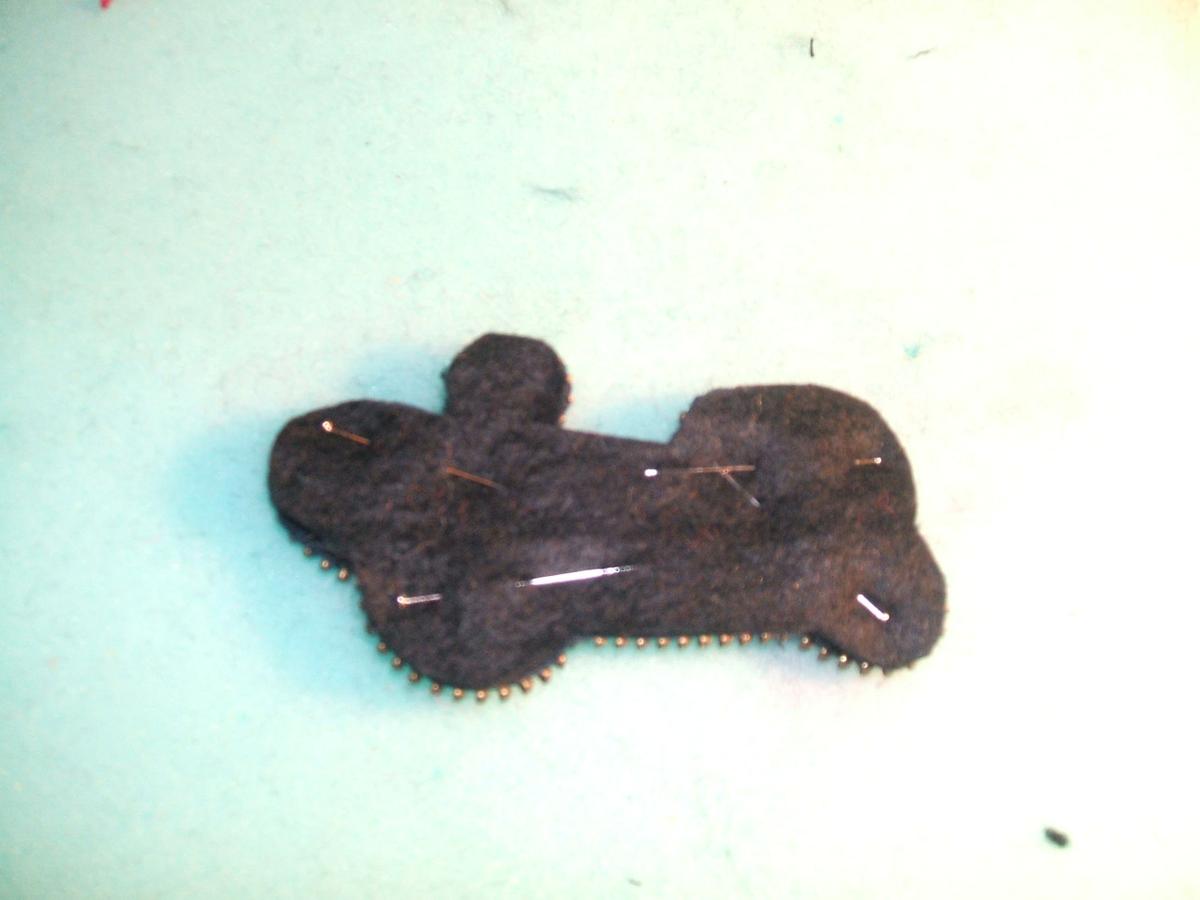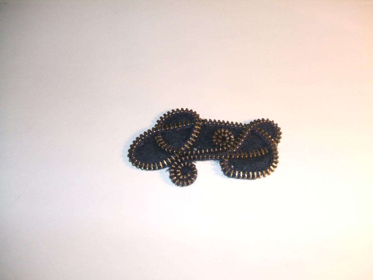 Ya sólo te queda rematar la parte trasera. Recorta un trozo de fieltro con la forma del broche, cose el enganche metálico que servirá para sujetarlo y cose la pieza de fieltro con el broche pasando pequeñas puntadas todo alrededor de manera que las puntadas se queden escondidas entre los dientes de la cremallera.