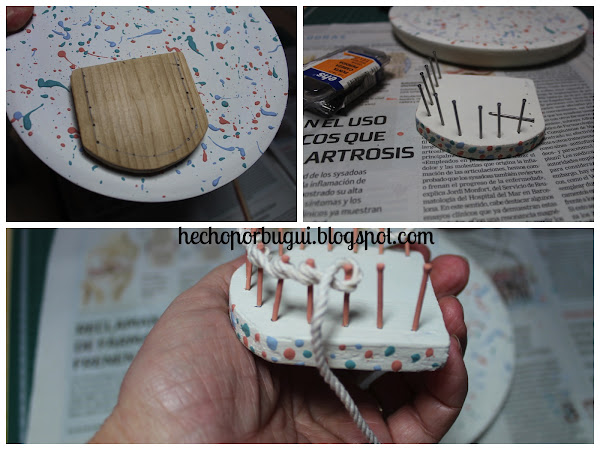 Con un retal de madera, a la que le redondee las puntas, dibuje un contorno y puse unos clavos.