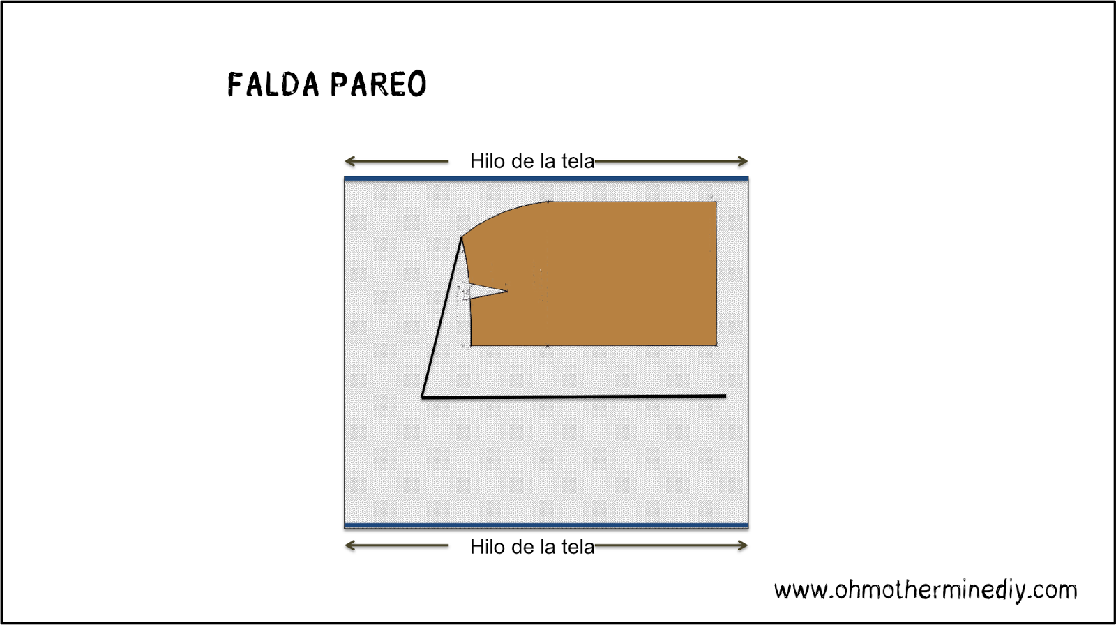 Para la pieza delantera superpuesta vamos a ampliar unos centímetros el ancho y dibujamos una línea diagonal a partir del lateral de la cintura. Al coser la cintura recta, este triángulo quedará descolgado en la parte delantera, dando ese efecto pareo.