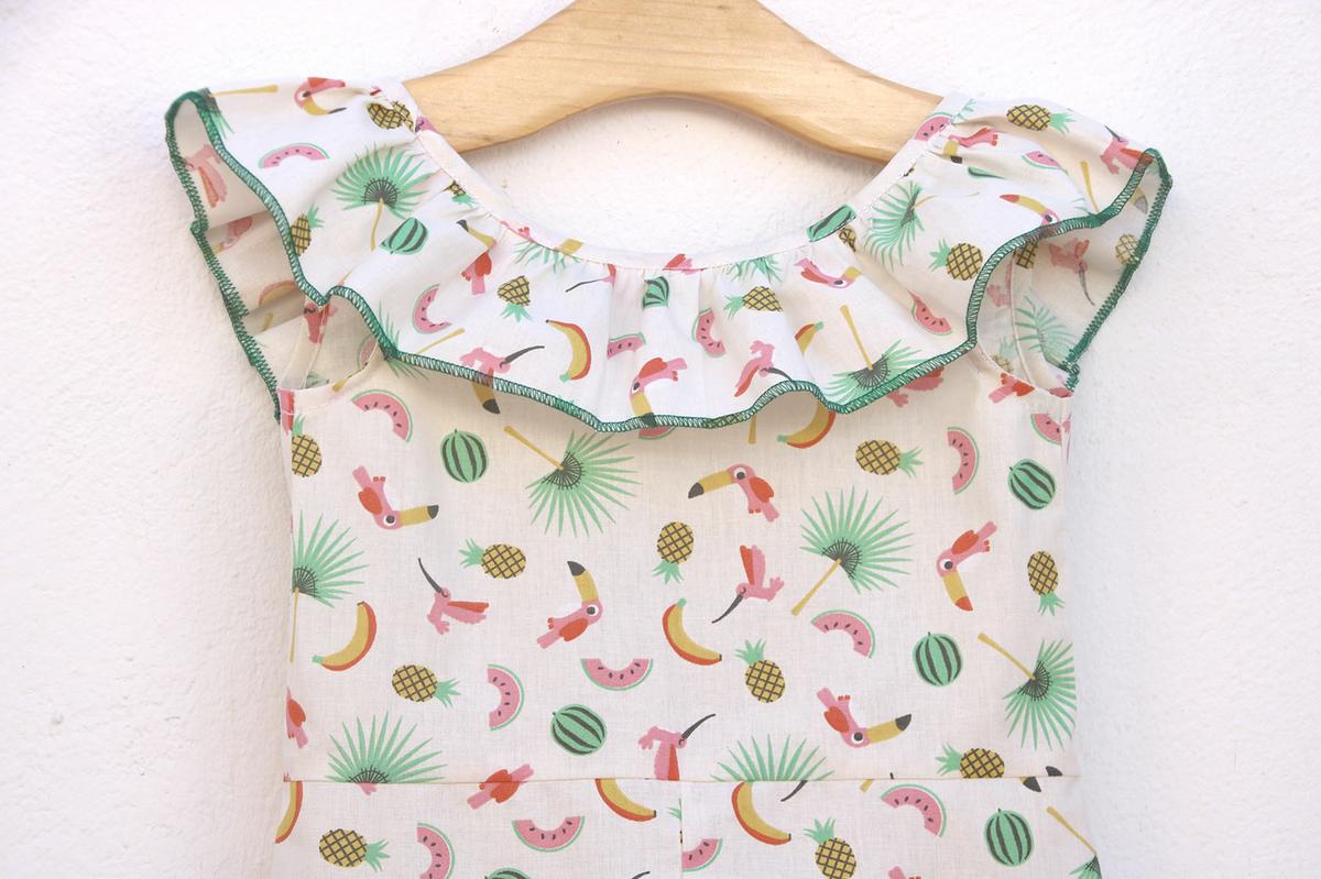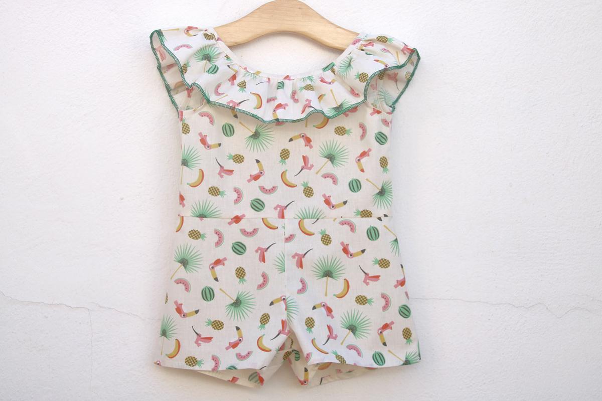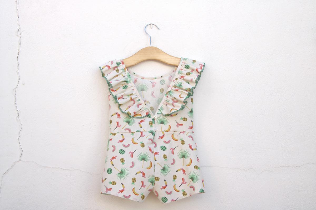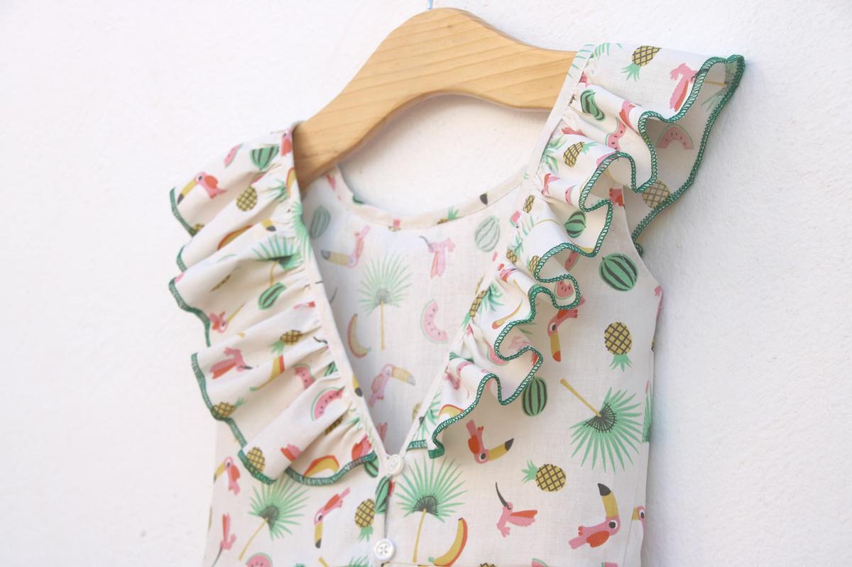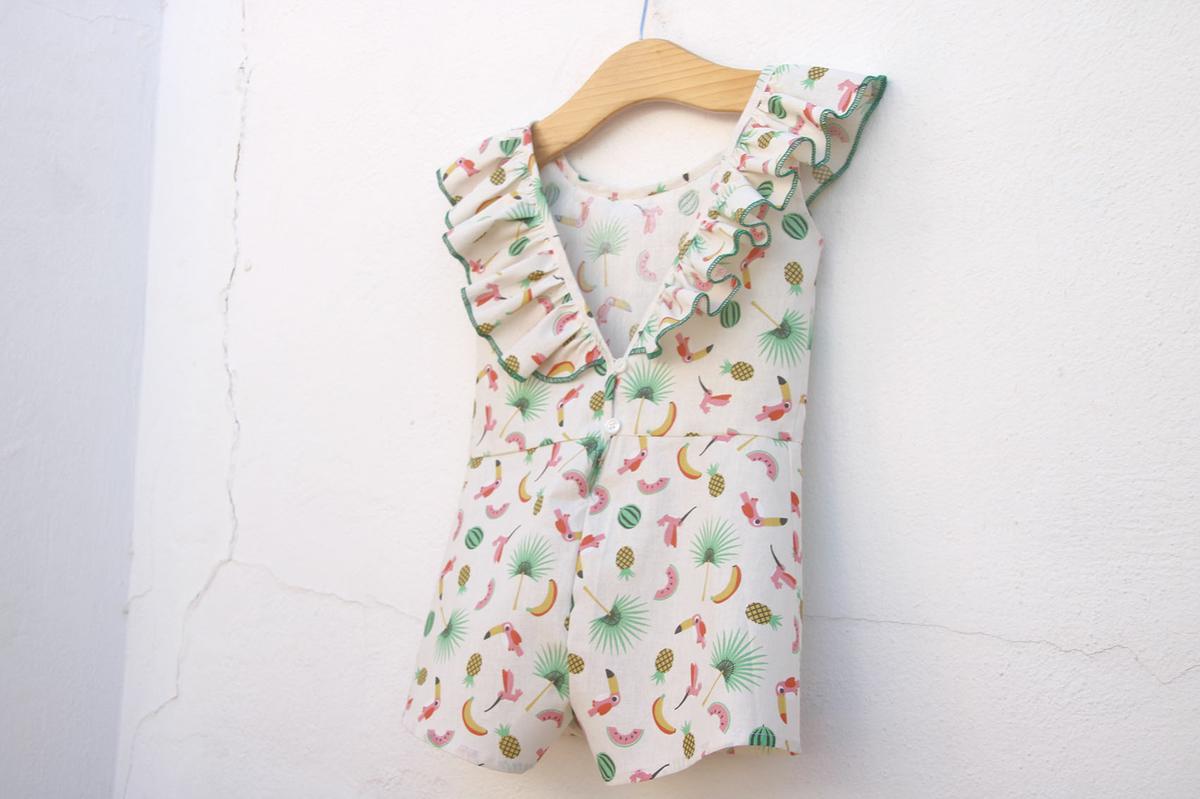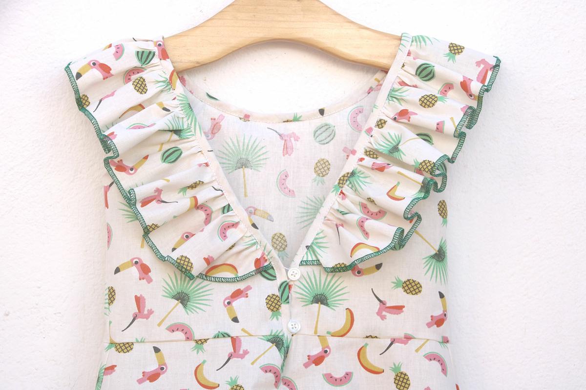 Aunque no estoy cosiendo, si que tenía cositas preparadas, una de esas prendas es este mono de tucanes para niñas. La confección es muy muy sencilla, además si elegís un popelín, os resultará aún más sencillo!!!! La espalda es abierta en forma de pico, el escote lleva un volante a su alrededor con un acabado en verde oscuro.