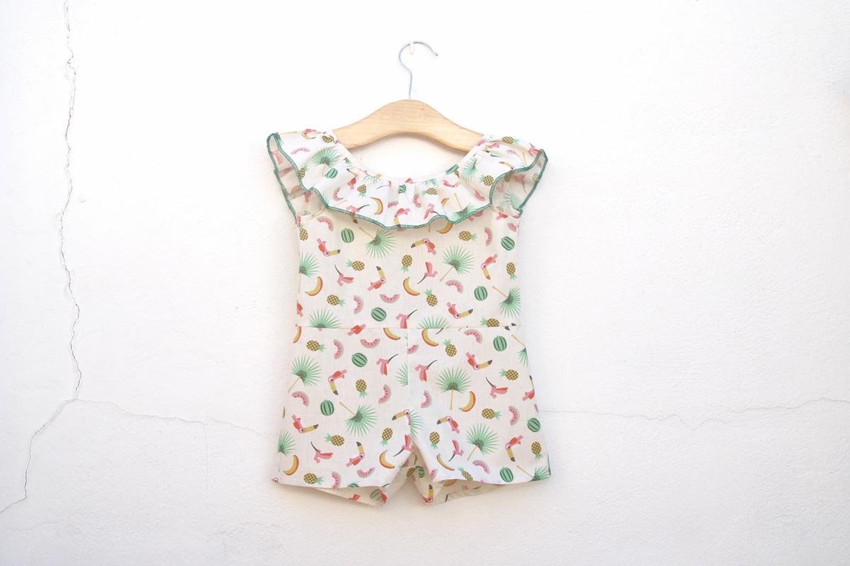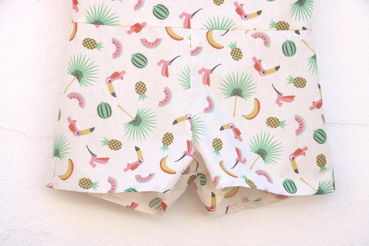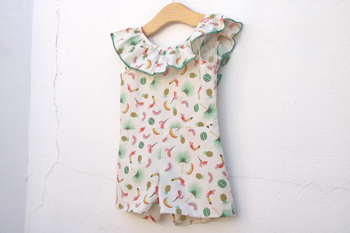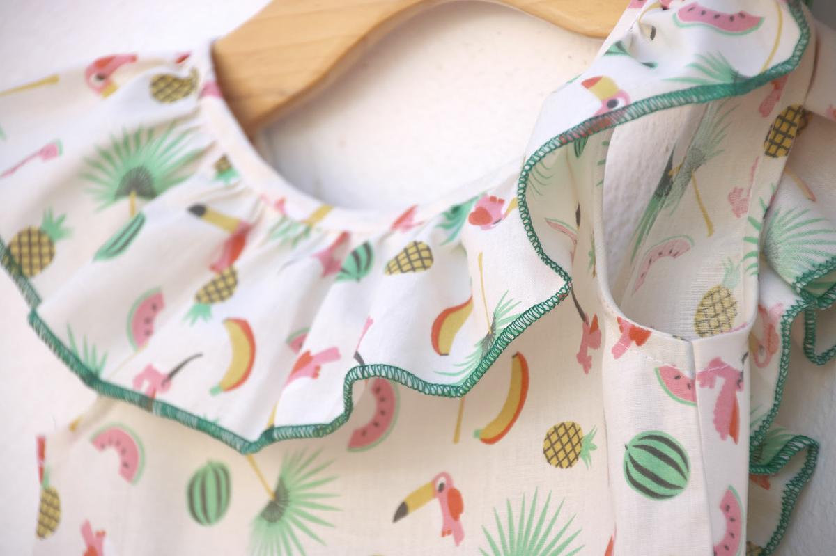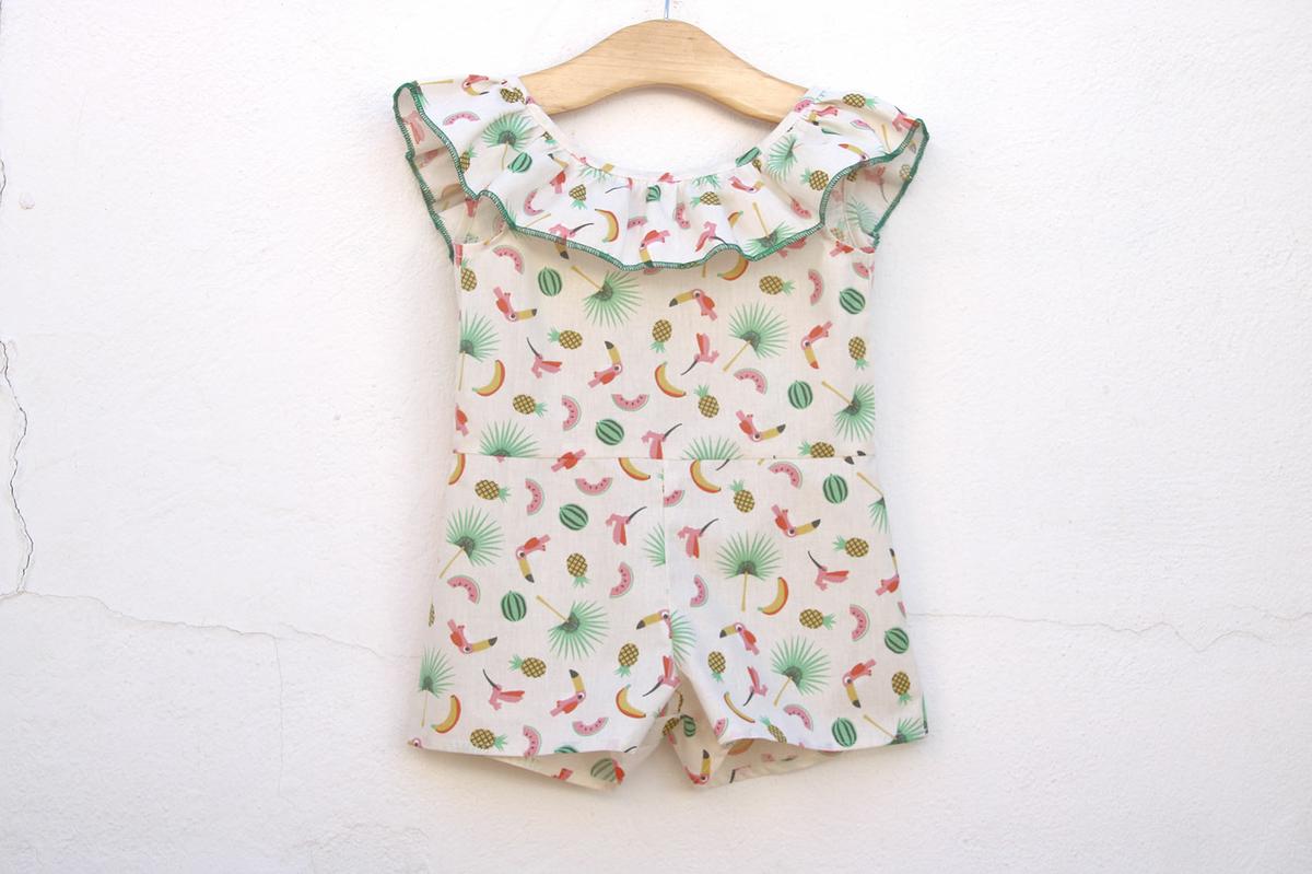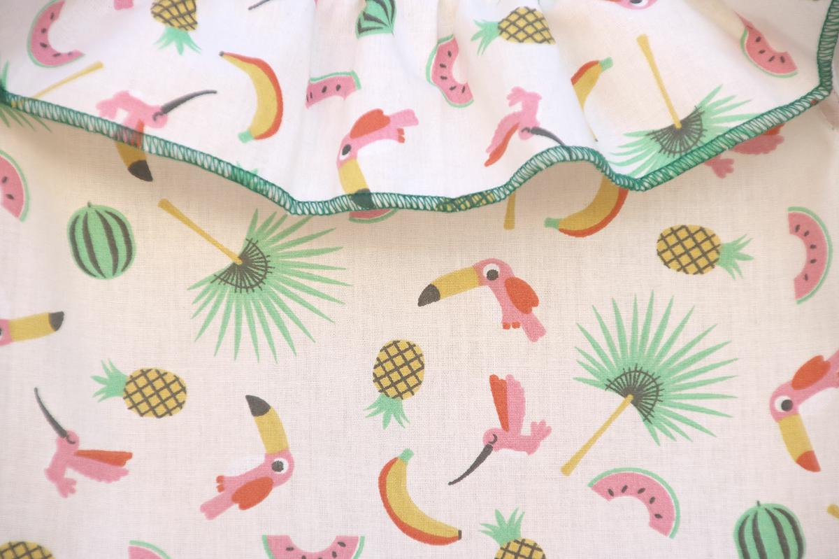 Aunque no estoy cosiendo, si que tenía cositas preparadas, una de esas prendas es este mono de tucanes para niñas. La confección es muy muy sencilla, además si elegís un popelín, os resultará aún más sencillo!!!! La espalda es abierta en forma de pico, el escote lleva un volante a su alrededor con un acabado en verde oscuro.