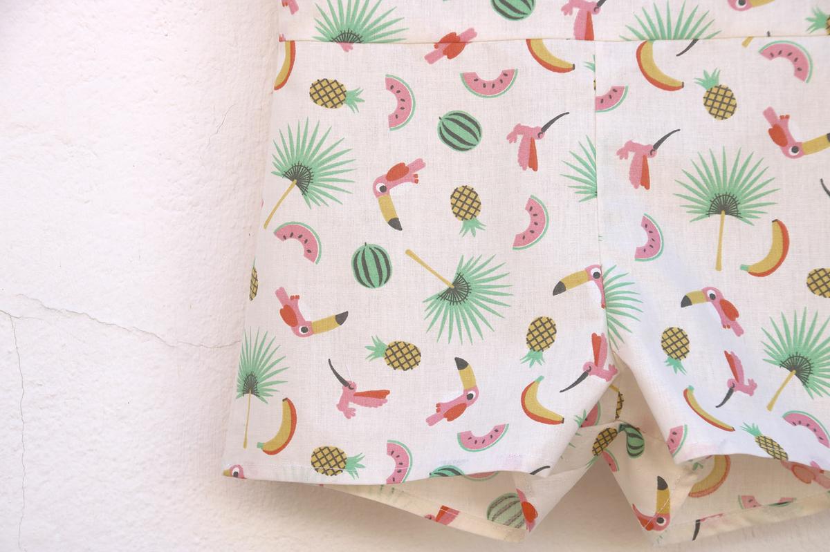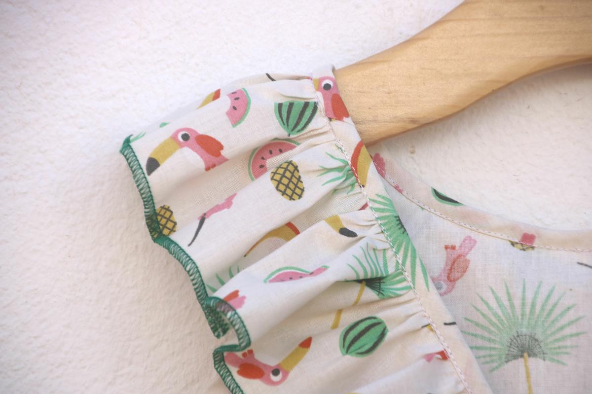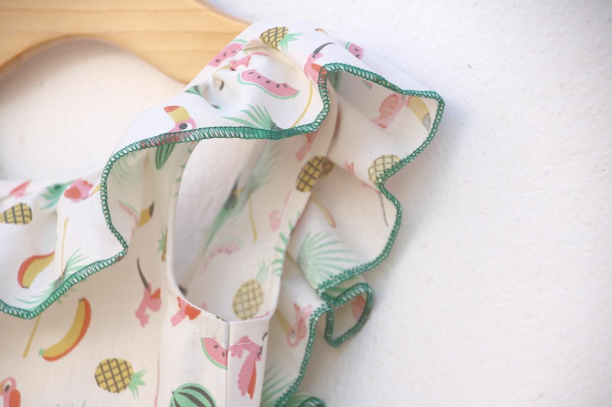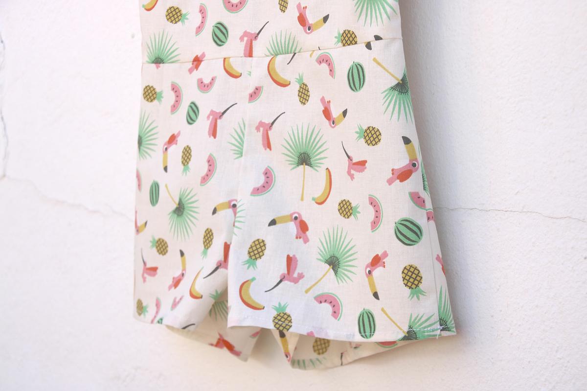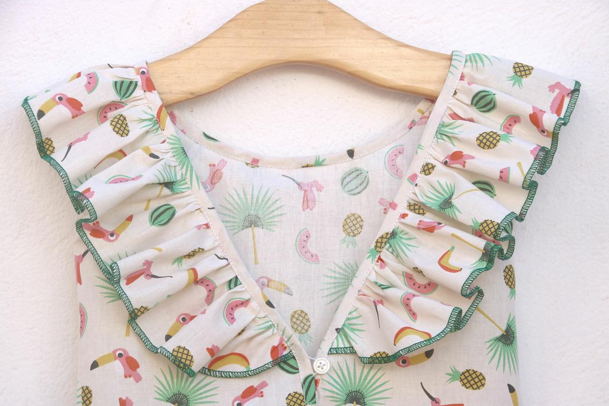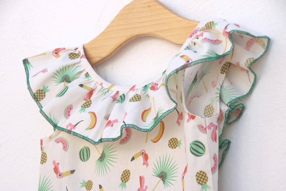Aunque no estoy cosiendo, si que tenía cositas preparadas, una de esas prendas es este mono de tucanes para niñas. La confección es muy muy sencilla, además si elegís un popelín, os resultará aún más sencillo!!!! La espalda es abierta en forma de pico, el escote lleva un volante a su alrededor con un acabado en verde oscuro.