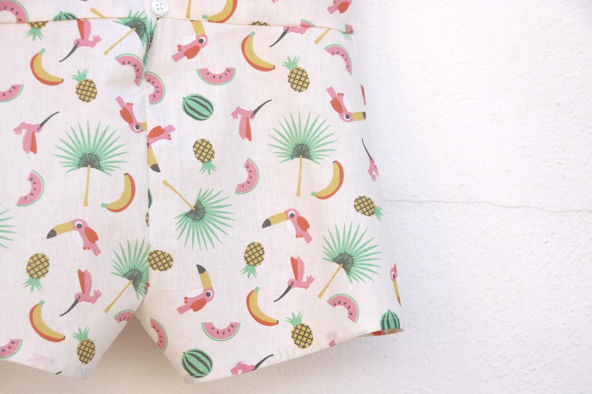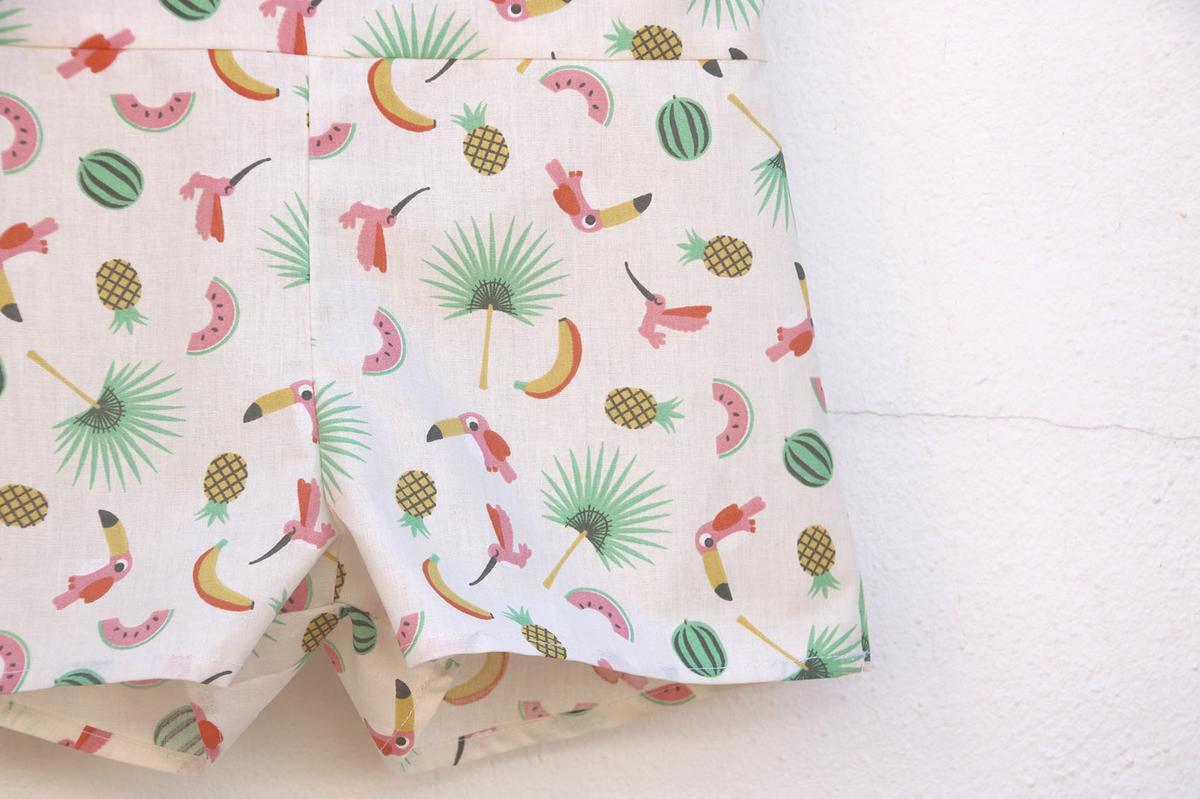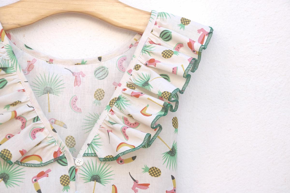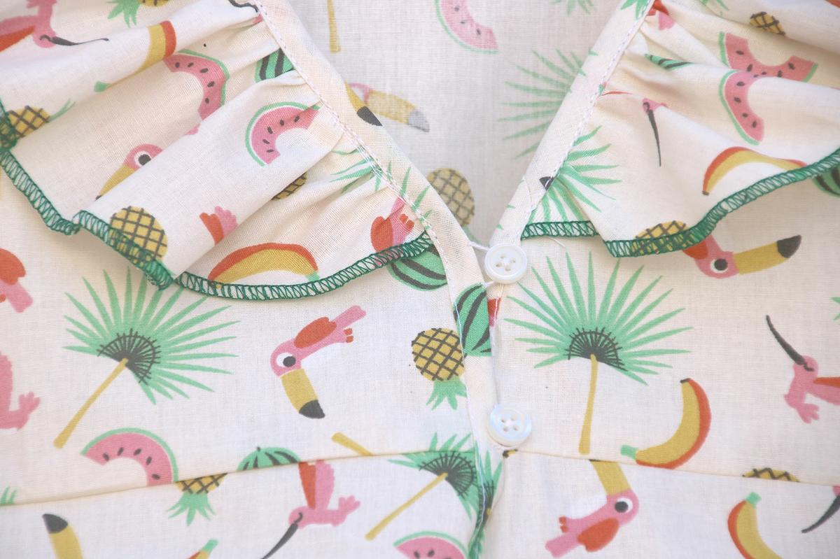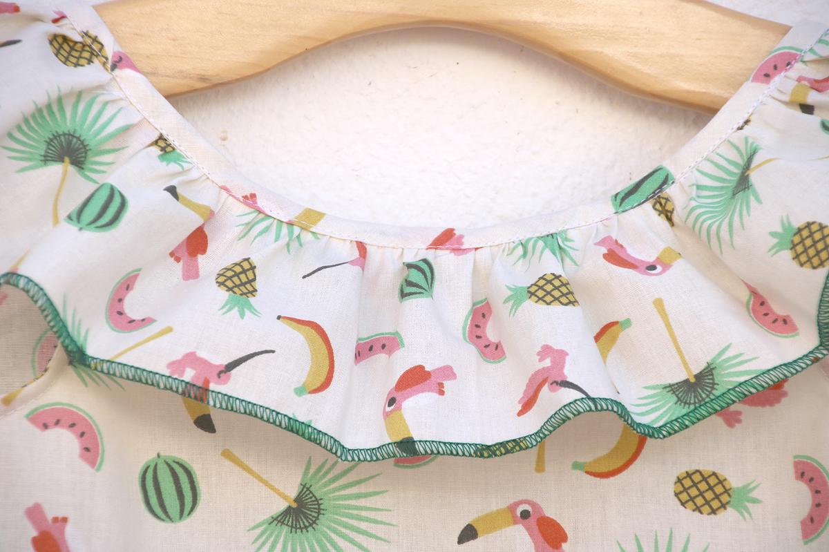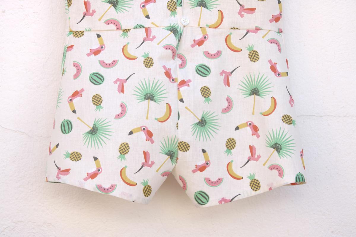 Aunque no estoy cosiendo, si que tenía cositas preparadas, una de esas prendas es este mono de tucanes para niñas. La confección es muy muy sencilla, además si elegís un popelín, os resultará aún más sencillo!!!! La espalda es abierta en forma de pico, el escote lleva un volante a su alrededor con un acabado en verde oscuro.