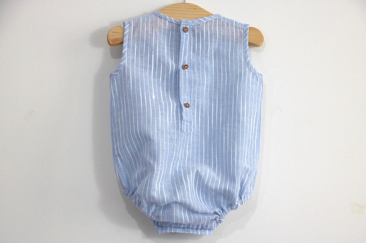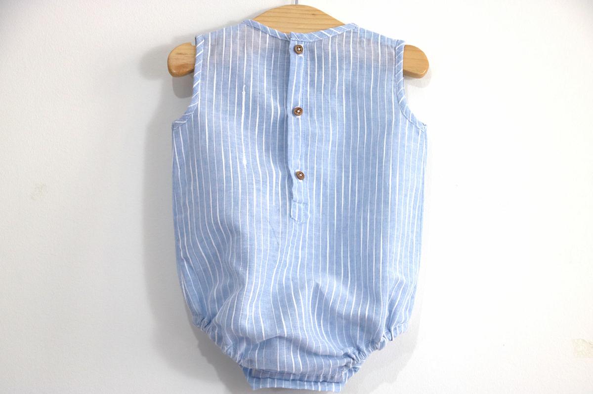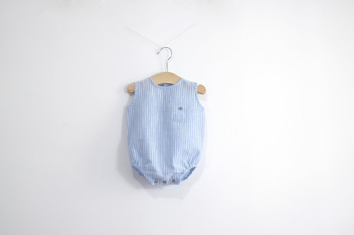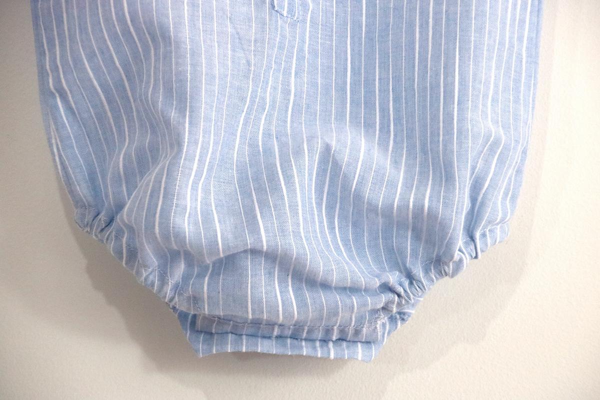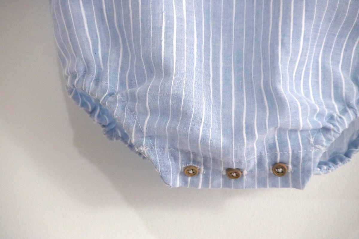 La tela que he elegido es una de las tendencias de esta temporada, lino de rayas!!!! Para este pelele le van cualquier tipo de tejido infantil: batista, algodón, piqué, lino, viyela, vichy….