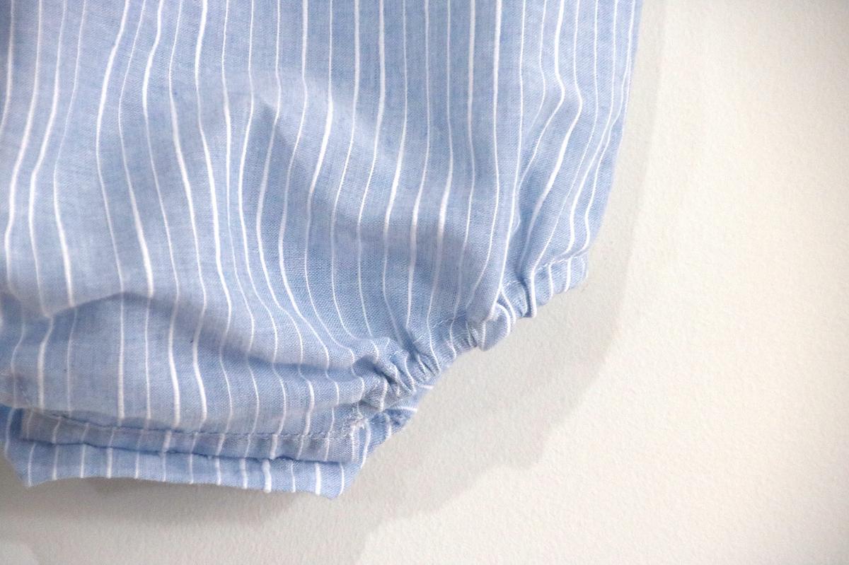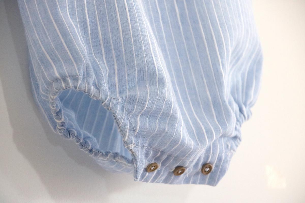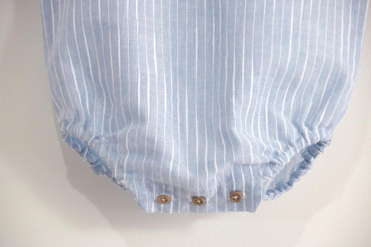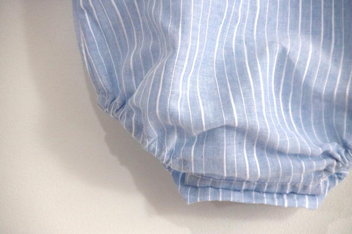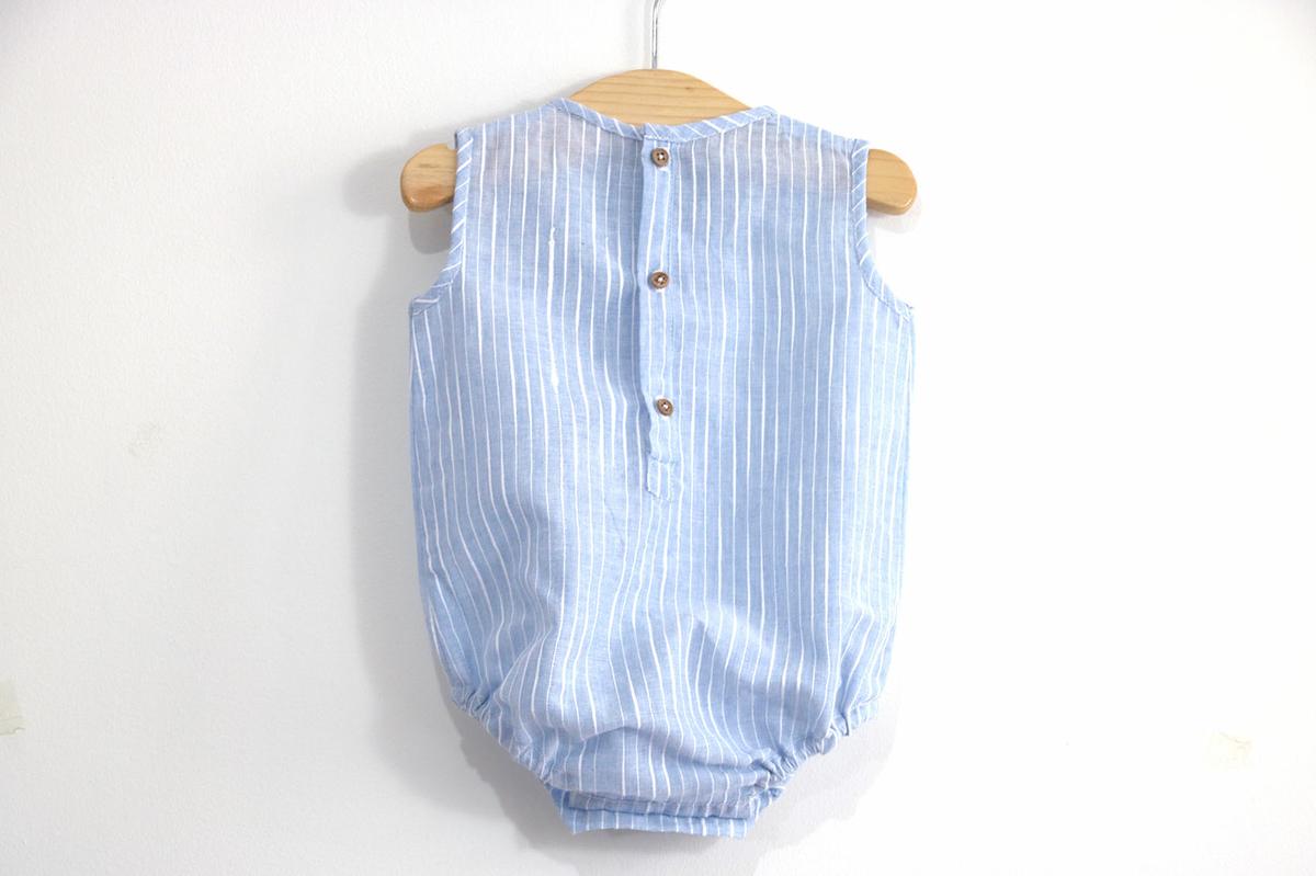 La tela que he elegido es una de las tendencias de esta temporada, lino de rayas!!!! Para este pelele le van cualquier tipo de tejido infantil: batista, algodón, piqué, lino, viyela, vichy….