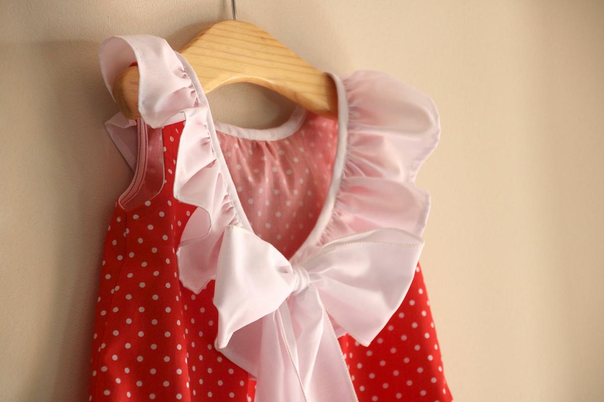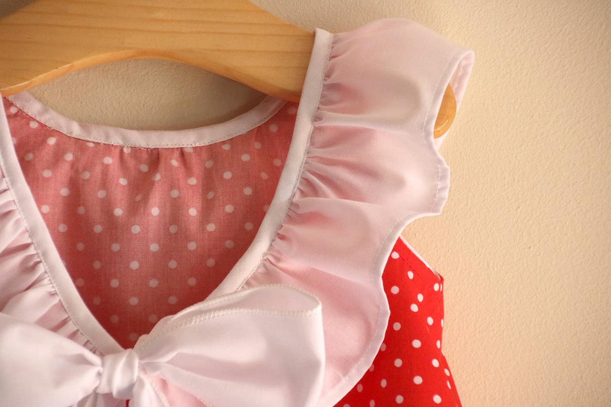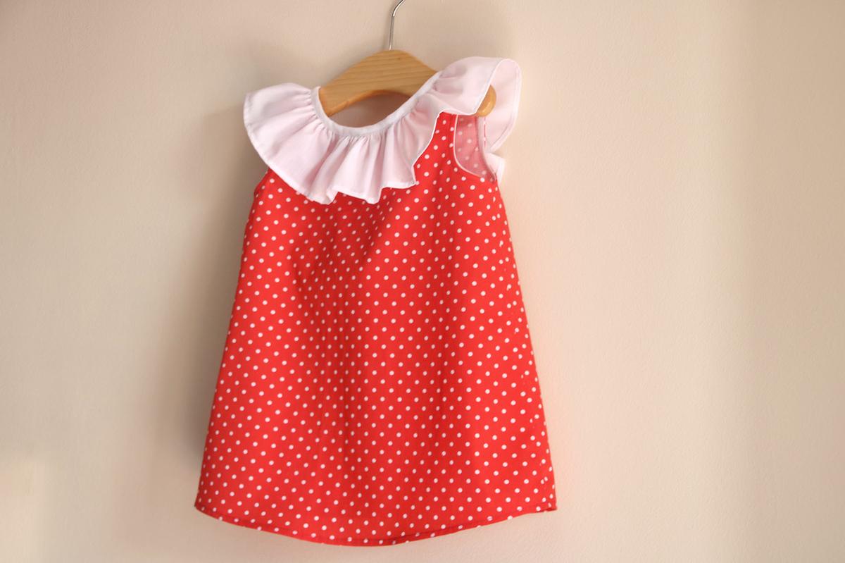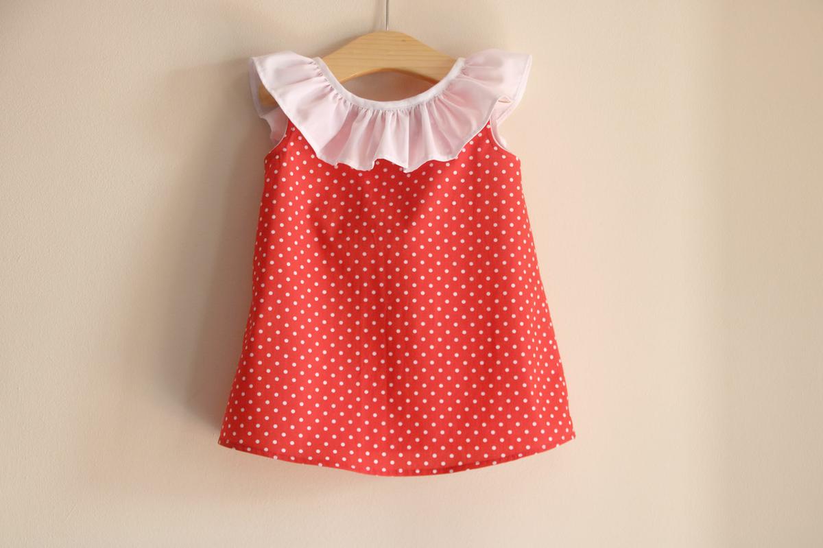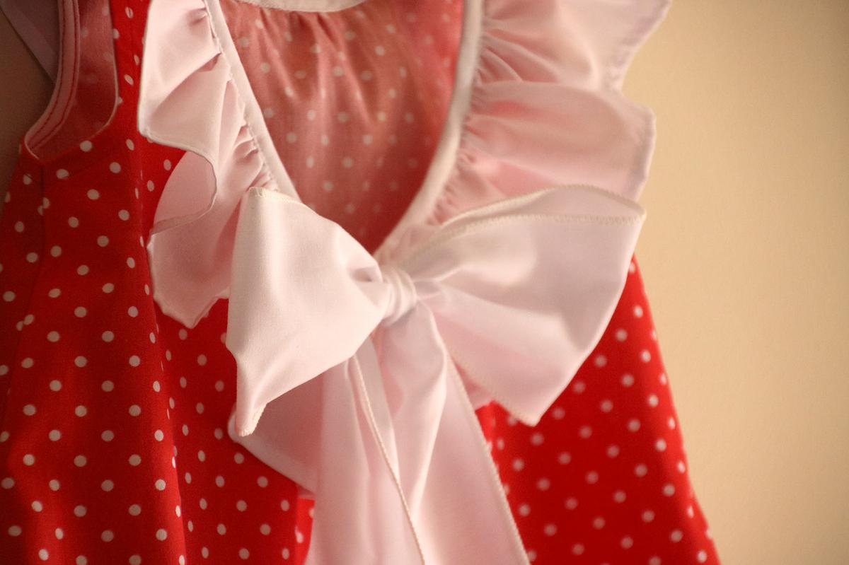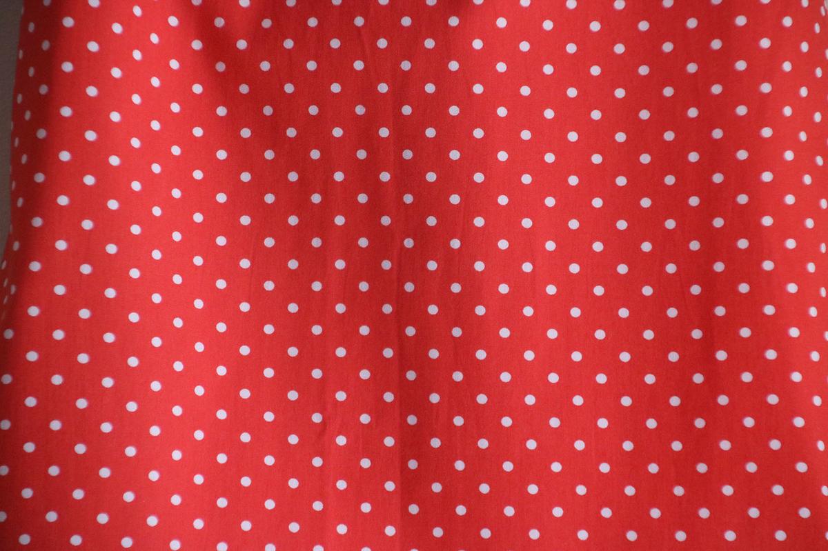 La tela que he utilizado para este proyecto es un popelín en rojo con topos blancos. Además la tela que he utilizado para el volante y el lazo, es también popelín pero en color blanco liso. Para este vestido podéis utilizar infinitas combinaciones que os van a quedar espectacular!!!! La tela que os recomiendo es algodón, aunque este vestido admite bastantes tipos de telas sobretodo infantiles.