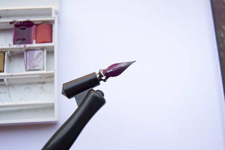 Simplemente tenemos que mojar un pincel con agua en la acuarela del color que queramos hasta conseguir una fluidez adecuada de la acuarela, y entonces impregnar la plumilla con el pincel.